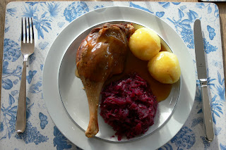 Dieser Wein harmonierte wunderbar mit einer kross gebratenen Gänsekeule mit Apfelrotkohl und hausgemachten Kartoffelklößen halb und halb.